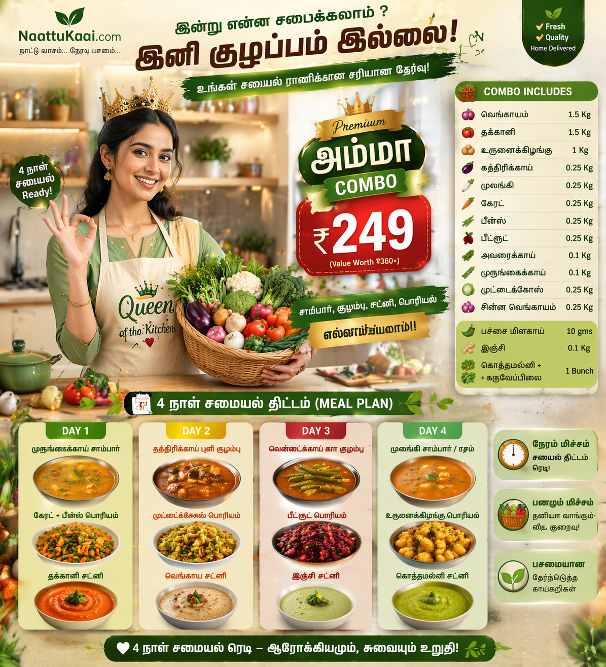 4 நாள் சமையல் ரெடி – சாம்பார், குழம்பு, சட்னி, பொரியல் எல்லாம் செய்யலாம்!”